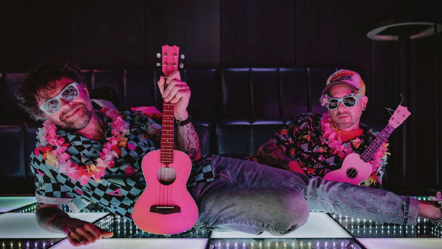 Eddy La Gooyatsh et Alex Toucourt créent le Ukulélé Machin Truc Orchestra pour assouvir leur soif d’interpréter les harmonies vocales de ces douces et langoureuses mélopées polynésiennes.
